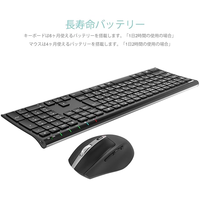 【長寿命バッテリー】業界大容量の充電式リチウムイオン電池搭載、1回フル充電で6ヶ月間が使えるキーボートと4ヶ月使えるマウス。「1日2時間の連続使用の場合」