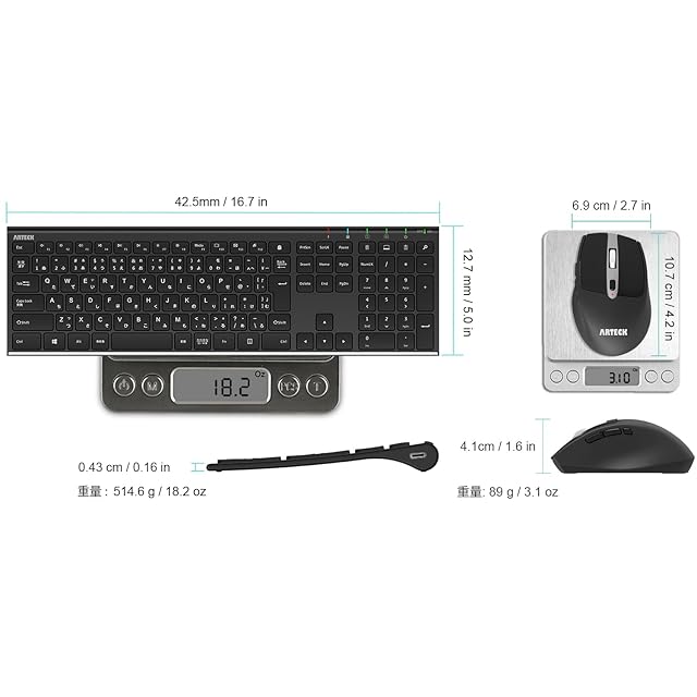 【製品内容】Arteck HW192無線キーボード、MW167マウス、共用の一つUSBレシーバー「マウスの裏面に収納」、USB Type-C充電ケーブル、ユーザーマニュアル、そして弊社人気の2年間のと親身なカスターマーサービスが付きます。