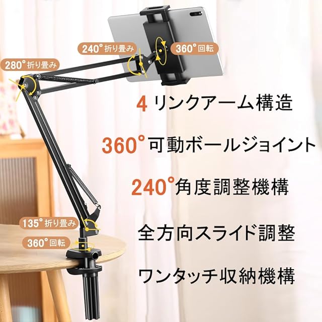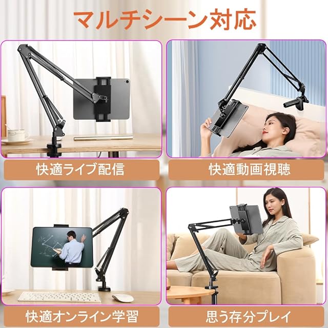 商品名:タブレットスタンド スマホスタンド ベッドサイド取付可能 ベッド用寝ながら 卓上 アーム 360回転 Zアーム型 横/縱き/仰向け 4つの関節 自由角度調整 折り畳み 揺れない iPad/iPhone/Surface/Galaxy/mini/Kindle/Switchに多機種対応 4.7~12.9インチ対応 ブラック