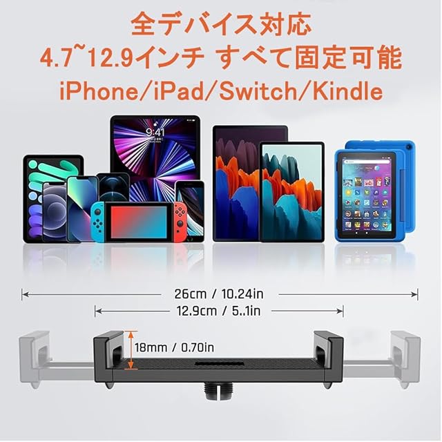 【全デバイス対応サイズ】4.7〜12.9インチ(約120-250mm)マルチデバイス対応: iPad全世代/iPhone/Android/Switch/Kindle/Fire HDなど。両側フック式ホルダーでケース装着時も固定可能。縦横画面切り替えはデバイスを外さずに即時変更。