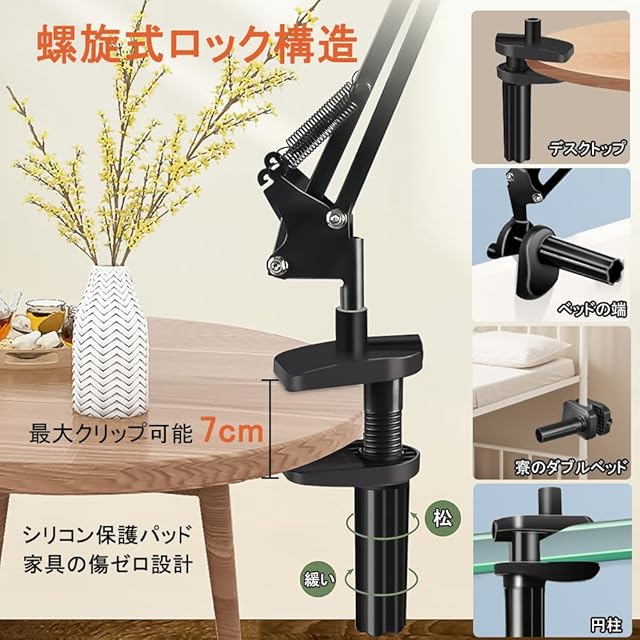 【多方向取り付け可能な設計】縦向き・横向きの両設置面に対応。独自開発の2穴土台でベッドサイド(侧/上)、デスク、壁面などあらゆる場所に固定可能。U字溝付きで丸いポールにも安定設置。最大100mmまで対応する拡大クランプ+滑り止めシリコンで、ずれ落ちを徹底防止。