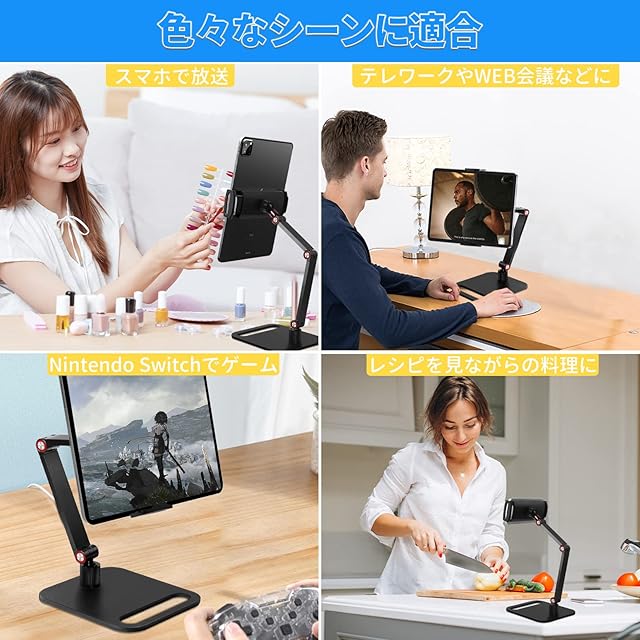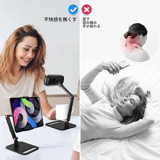 【自由に調整できる&両手を解放し】 最新のスタンドは三つの回れる関節と自由に回る金属ダブルボールを備えて、普通なブラケットより、一層柔軟になります。3段式のアームとボールジョイントで角度を自由に調整でき、一般的なアームよりも自由度が高く、より好きな角度に固定でき、最も快適な視角を調整できます。使わないときには折りたたんでおけます。