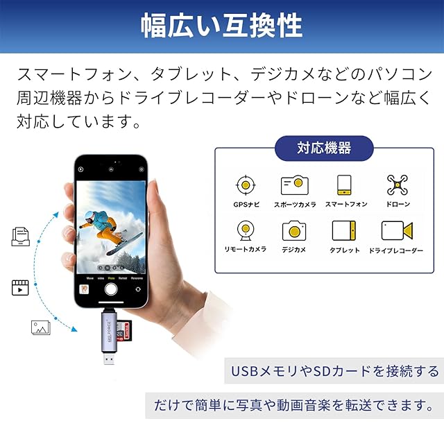 【USB-A/USB-C カードリーダー】USB-AまたはUSB-CのPC、スマートフォン、タブレットに対応。本製品にSDカード等を差し込み、対応のデバイスと接続するだけで簡単に写真や動画、音楽などのデータを転送します。SD、SDHC、SDXC、MMC micro、RS-MMC、microSD、microSDXC、microSDHC、容量2TBのカードまで使用可能。コンパクトサイズで持ち運びにも便利です。