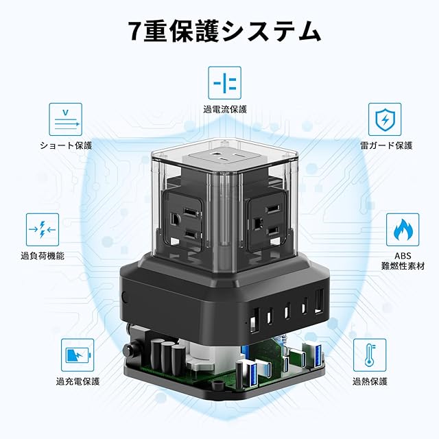 【落雷保護と過負荷保護】このoaタップは絶縁キャップが装備されており、トラッキング火災の防止に有効です。耐火性ABS+PC材料により、最高750℃までの耐火性があります。アース付きで電磁波対策が取れること以外、このコンセントusb付きは高性能雷サージ吸収素子を内蔵しており、雷によるパソコンやAV機器への被害防止に効果的です。さらに、最大2400Wを超えると電流を遮断する「サーキットプロテクタ」を採用し、過負荷・過充電・過熱・過電圧・ショート保護を搭載、PSE(電気用品安全法)認証取得済みの商品で、安全性には万全を期しています。