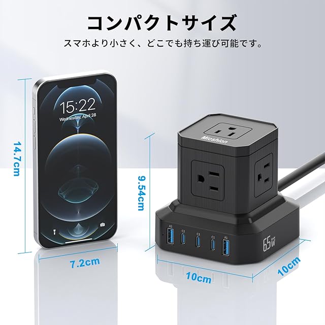 【高出力2400W&コンパクト】市販品の1500Wと比べて、このマルチタップは広範囲電圧技術を採用して、総電力は2400Wまで対応可能です。それに加えて、多数の差込口を備えながらも、幅8×奥行き8×高さ8.3cmとコンパクトで、省スペースで使えるので、デスクの上やテレビ周りなど、さまざまな場所で重宝します。重さは432gと軽量で、持ち運びもしやすいので、旅先や出張先でのコンセント不足を解消できます。海外でも使用可能です。