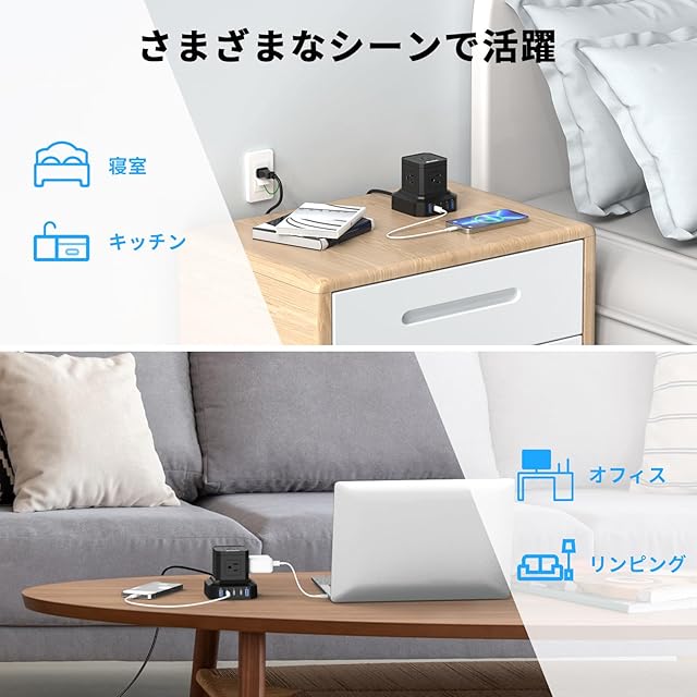 【キューブ型電源タップ】このタコ足コンセントは、立体集成構造を採用し、コンパクトで省スペースです。キューブ型形状により、電源タップに接続した際も隣のコンセントへの干渉を抑えます。卓上で安定感をもたせるため電源コードを底面近くに配置した低重心設計を採用しており、重いアダプターをかけても倒れにくいです。パソコン周りやテレビ周りなど、限られたスペースを有効活用できます。