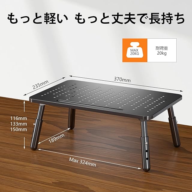 【丈夫で安定性抜群】頑丈なスチール製で、しっかり物を支えます。脚の下部にはゴムパッドがあるので、滑り止めることができて、傷を防止することもできます。20kgまでのノートパソコンとモニターを載せることができます。