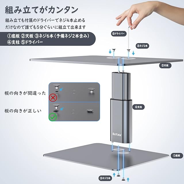【飽きの来ないデザイン●組み立て式】モニタースタンドの表面仕上げは程よい艶消しで、非常に高級感あります。デザインもシンプルで周辺の機器と馴染みやすいです。ネジ止めして組み立てるタイプですが、分かりやすい説明書や工具を付属されており、簡単に5分内に組み立て出来ます。●梱包:板や支柱、ネジ6本(予備2本含め)、滑り止めパッド6枚、六角ネジ用ドライバー、日本語説明書など。