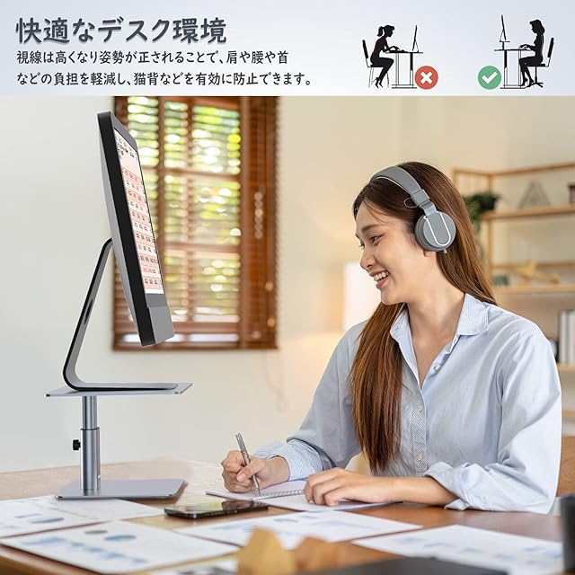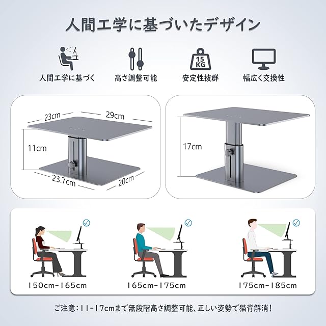 【高さ調整●作業効率アップ】モニタースタンドは支柱のネジ一つで高さを11~17cmまで稼働します。お使いの机と椅子の高さにあわせて最適な目線にディスプレイの高さを調整することができます。高さが目線に調節できることにより、姿勢がよくなって腰と首の痛みが解消でき、テレワークが快適になり、作業効率も格段に上がります。高さ調整中ネジ締め不足なら、安定性に影響があるのでご注意ください。