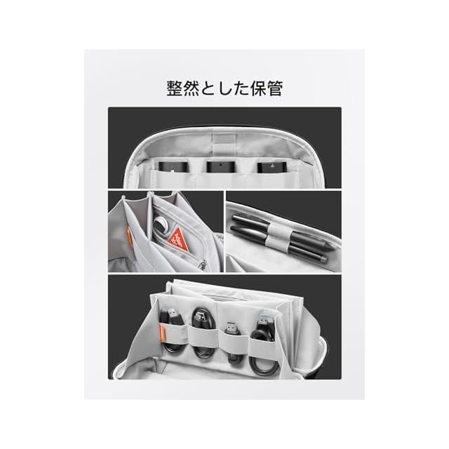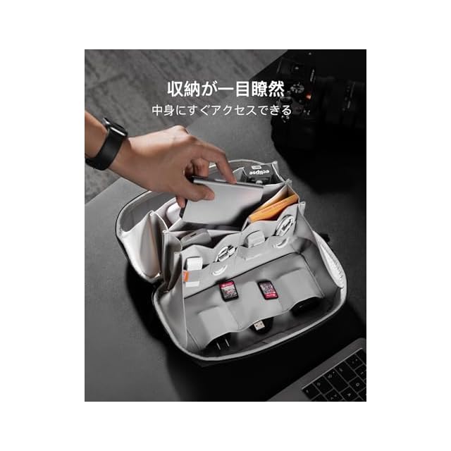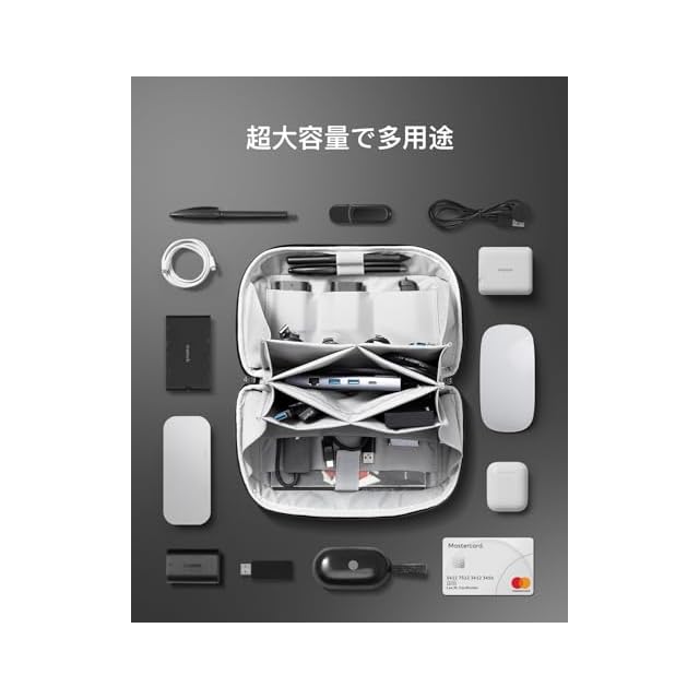 整然とした保管:充電器、ハードドライブ、モバイルバッテリー、マウス、イヤホン、USBケーブル、ノートブック、ゲームカード、ペンなどを保管すできる様々なサイズのコンパートメントまたはポケットが12個あります。物の大きさごとに分類を行うことで整然としているポーチを作ることができます。