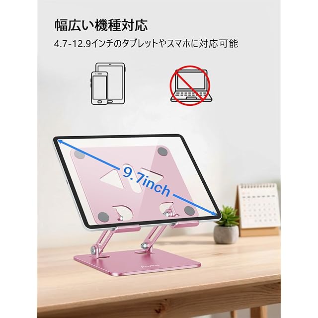 【幅広い対応性】 このタブレットスタンドは4.7インチから12インチまでのスマートフォンやタブレットに対応しており、iPhone 16、15、14、13、12、11、X、8、7、iPad Pro、iPad Air、iPad miniなど、4.7インチから12インチのタブレット・スマートフォンに対応しています。