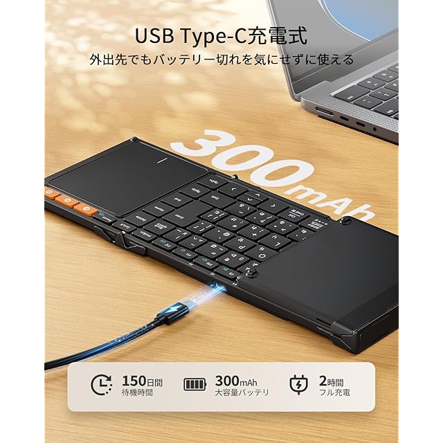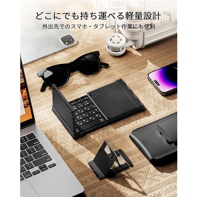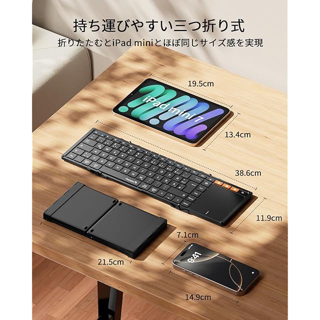 【三つ折り式&持ち運びやすい】作業の効率性と携帯性のバランスを考慮しながら使いやすさを追求したXK01 TP 折りたたみキーボードが初登場!重さは約297gと軽量でコンパクトなので、外出先や移動中の作業に非常に便利です。折りたたむとiPad miniとほぼ同じサイズになるため、使用しない時はカバンの隙間やパソコンバッグに簡単に収納できます。また、専用のPUレザー製収納バッグとスマホスタンドが付属しており、自宅だけでなく、カフェや図書館、オフィス、飛行機など様々な場所で快適かつ効率的に作業できます。これ1つでどこでも快適な「ミニ作業環境」を作れます。(展開時サイズ: 38.58 × 11.89 × 1.22cm/折りたたみ時サイズ: 21.49 × 11.89 × 1.98cm)