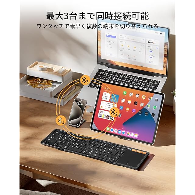 【3台同時接続可能&マルチOS対応】高性能と低消費電力を両立するBluetooth 5.1により、最大約10mの範囲で安定した接続が可能です。この折り畳みキーボードはAndroid、Windows、iPad OS、macOS、iOSなど幅広いOSに対応しており、最大3台のデバイスを同時に接続できます。ボタン一つでスマホやタブレット、PC、iPad、iPad mini、iPad airなどの端末を素早く切り替えられます。複数のデバイスを頻繁に使い分けている方にぴったりです!(※USBレシーバー接続と有線接続に非対応)