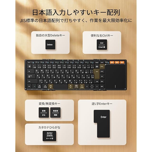 【打ちやすい日本語配列&13種類の便利なファンクションキー】JIS規格に準拠した標準日本語配列を採用したBluetooth キーボードには、逆L字の縦長Enterキーや半角/全角キー、変換/無変換キー、右Ctrlキー、独自の大型Deleteキーなどの日本語入力に特化したキーが配置されているため、打ちやすく、日頃お使いのキーボードから違和感なく移行できます。また、アプリ切り替え、ホーム画面表示、音量調整など13種類の実用的なファンクションキーを備えているため、利便性が高く、様々な操作がワンタッチで行えます。作業効率が大幅にアップ!