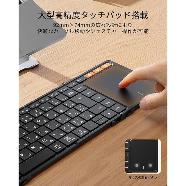 【大型の高精度タッチパッドを搭載】ipad キーボードの右側には、9.2cm x 7.4cmの大型かつ高精度タッチパッドを搭載しており、指先で画面スクロールやジェスチャー操作がスムーズに行えます。また、左右のクリックボタンも付いているため、マウスなしでもカーソルを快適に操作できます。(※注意: 1. iPadをご利用の場合は、ご使用前に「AssistiveTouch」をオンにしてください。2. タッチパッドは(iPhoneなどの)OSやアプリによっては一部のジェスチャー機能が利用できない場合があります。3. スクロール方向は、(Mac/iPad/Windows10/11など)一部のデバイス側で設定可能です。4.折り畳み部にロック機能がないため、平らな場所での使用を推奨します。5.タッチパッド(カーソル)の感度が悪い場合は、お使いのデバイスのタッチパッドの設定画面でタッチパッド(カーソル)の感度を調整できます。)