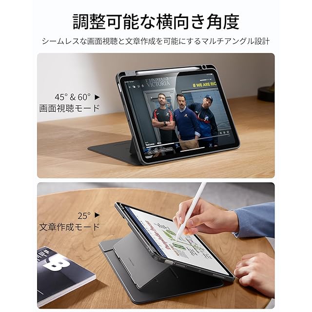 【マルチアングルデザイン】:2つのスタンドモードに対応しており、45°~60°はビデオ鑑賞、作業、FaceTimingなどに最適なビューイングモードへと、25°に調節した場合は執筆、絵画、その他のクリエイティブな作業に最適なライティングモードへと用途に合わせて角度調節が行えます