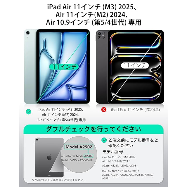 【互換性】:iPad Air 11インチ (M3/M2、2025/2024モデル)、iPad Air 10.9インチ (第5/4世代、2022/2020モデル) に対応。モデル番号:A3266、A3267、A2902、A2903、A2316、A2324、A2325、A2072、A2588、A2589、A2591。ご注意:iPad 11世代(11インチ)と他のiPadモデルには非対応です。互換性を確認するには、iPadの背面下部にあるモデル番号「AXXXX」を確認してください。
