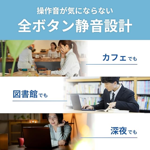 【静音ボタン採用】クリック音が静かな静音スイッチの採用で、会議中やカフェなどでも気にせずご利用いただけます。