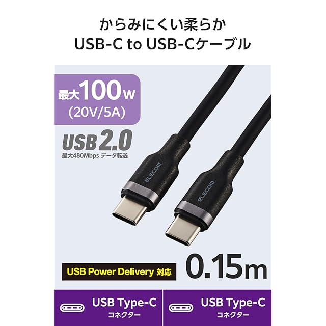 エレコム USB Type C ケーブル 0.15m 短い 100W PD対応 高速充電 シリコン素材 なめらか やわらか 【 MacBook/iPad/Galaxy/Android スマホ タブレット 等対応 】 ブラック 【iPhone 16 シリーズ 対応検証済】 MPA-CCECSS015BK | つむぎ屋