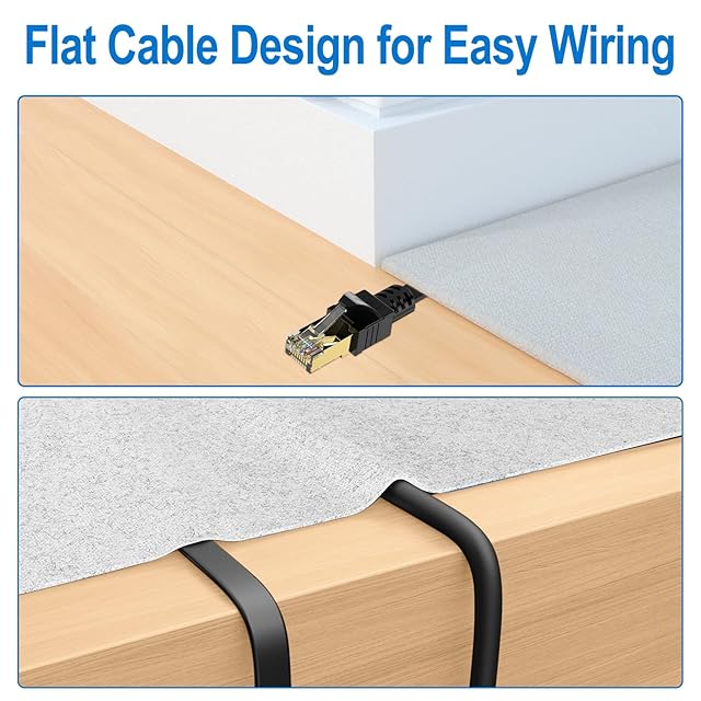 柔軟なフラットデザイン: Cat 8 RJ45ケーブルはフラットなデザインで、コードの絡まりを防ぎ、スペースを節約します。 Flat LANケーブルは非常に柔軟性があり、どんな表面にも沿って隠れたり走ったりするのが簡単です。 ドアの下に設置したい場合でも、窓からもカーペットの下に隠す場合でも、とても簡単にできます。 屋内配線に非常に適しています。