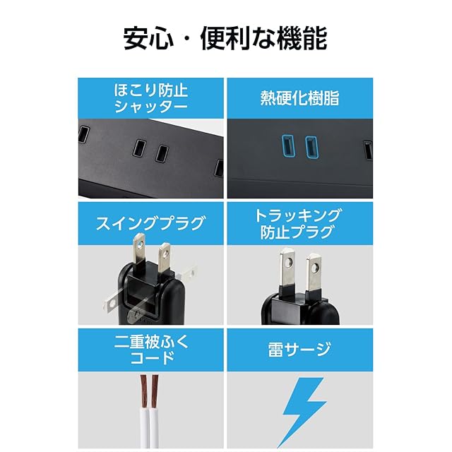 差込口にプラグが差し込まれていない場合にほこりの侵入を防止する「ほこり防止シャッター」を装備しています。