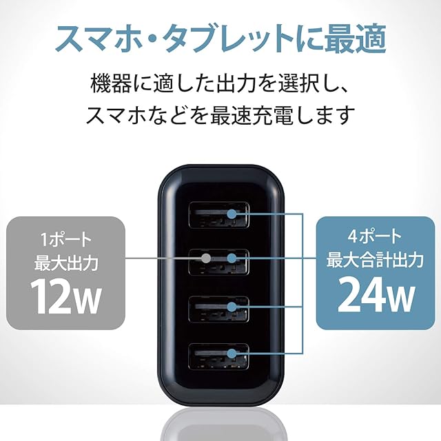 1ポート最大出力12W(5V/2.4A)、合計最大出力24W(5V/4.8A)の高出力タイプです。