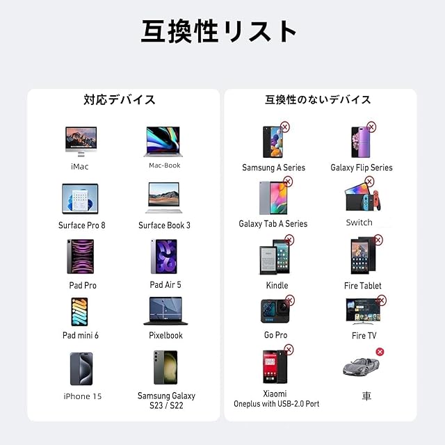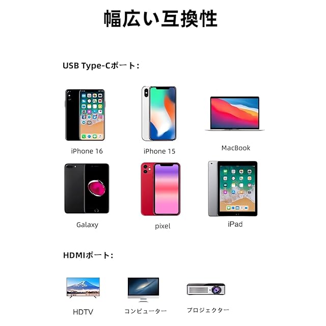 【幅広い互換性】ほとんどのType-Cデバイスに対応し、USB 3.1またはThunderbot 3/4のType-CポートでDex/MHL/DP Alt Modeをサポート。iPhone 16シリーズ、iPhone 15シリーズ、Mac-Bok Pro/Air、Pad Pro/Air/Mini、XPS、Surfae - Book Laptp Pro、Gala-xy、タブレットなどと互換性があります。Hua-wei P20 Pro、P30、P40、P50,および DP Alt モードをサポートするUSB C デバイス。(ご注意:Sony Xperia、Xiao-mi 、Sharp -Aquosについて、ほとんど非対応機種となりますので、ぜひお先にお問い合わせください。)Sam-sung は DeXをオンにする必要があり、通常の携帯電話はテレビに接続するために USB デバッグをオンにする必要があります。