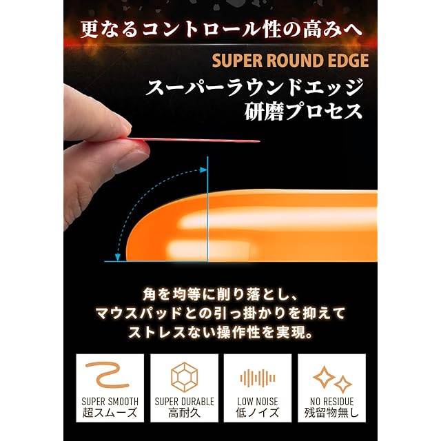 【ラウンドエッジ加工】角が削ぎ落とされており、マウスパッドとの引っ掛かりが少ないマウスソールです。
