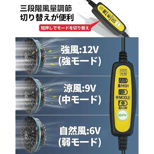 【3段階風力調整】3段階風量調整(高/12V、中/9V、低/6V)、自由に風量を調整できます。【ご提示】 長時間使用すると、スイッチ部分には少し発熱状況になる場合がありますのであらかじめご了承ください!気になる方はご注意ください。