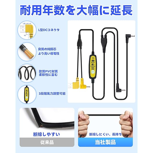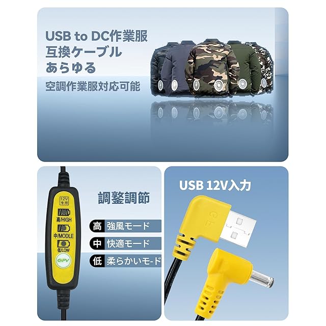 空調作業服用 ファン 12V USB DC ケーブル USB to DC 作業着互換ケーブル 3段階風力調整(高 中 低) モバイルバッテリー用コード 互換用 ユニバーサル あらゆる作業服ファン対応 | つむぎ屋