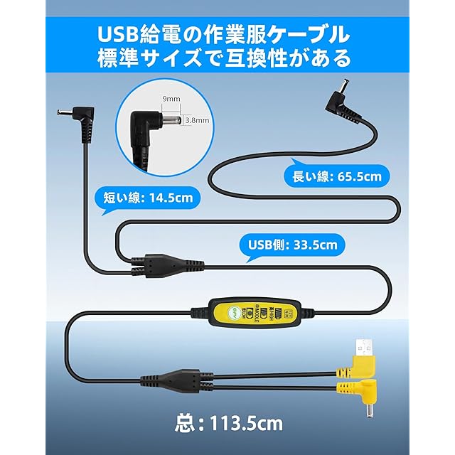 【商品情報】:空調作業服 USB ケーブル、強風と同等の出力を実現します。 / USB電源ケーブルの全長は約113.5cmです。 モバイルバッテリー側:USBポート、ファン側:オス DC内径:1.4mm ,外径:3.8mm。