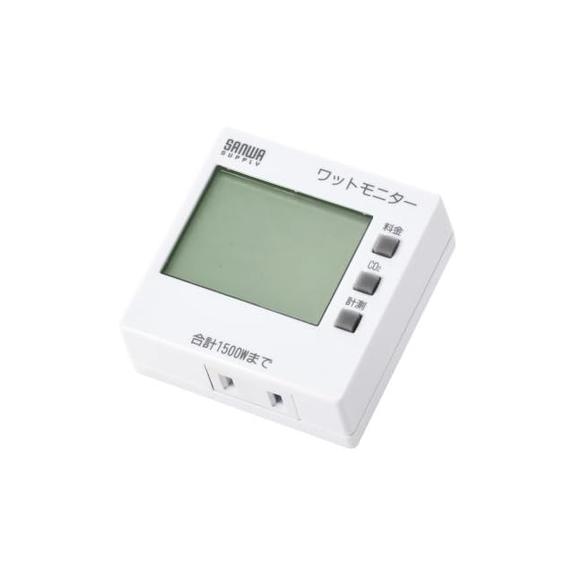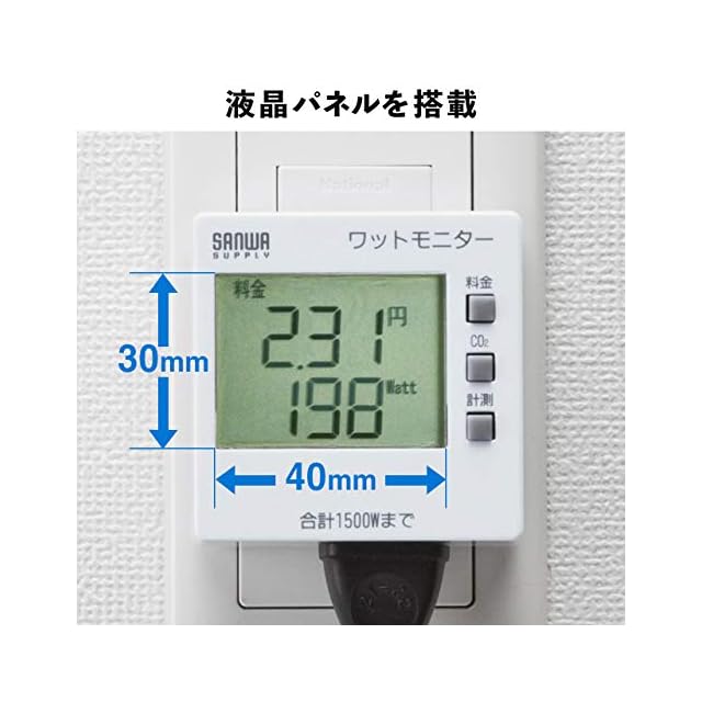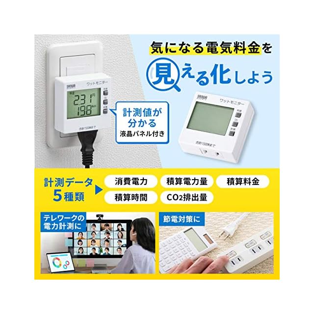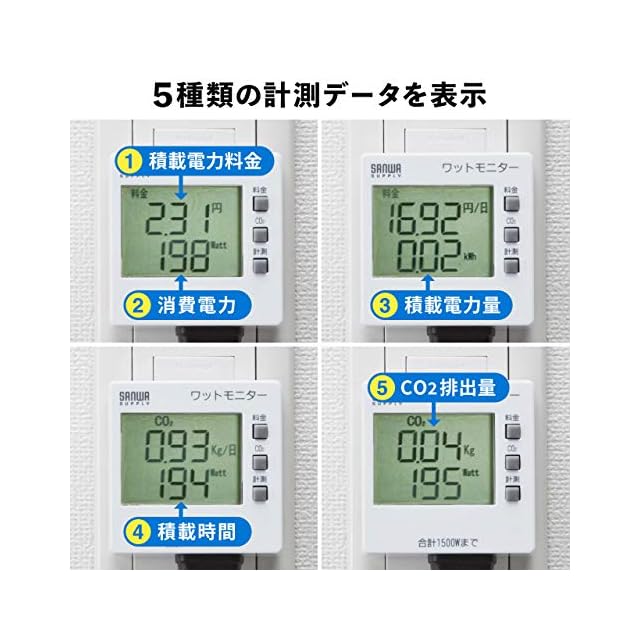消費電力(W)、積算電力量(kWh)、積算時間(Hour)、積算電力料金(円)、CO2排出量(kg)の5種類が測定できます。
