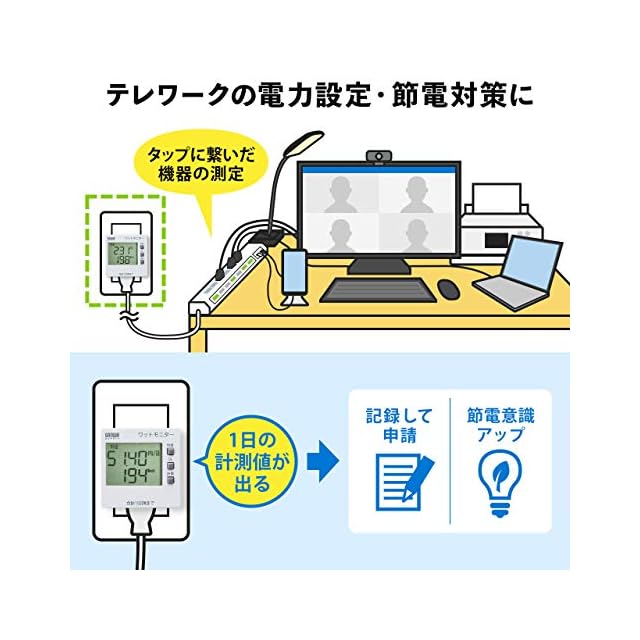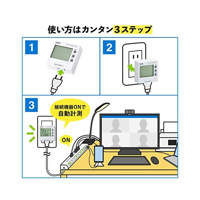 <使用方法> 本体下面差込口に測定する機器の電源プラグをしっかり差し込んで、壁のコンセントなどに差し込みます。測定したいボタンを押して数値を読み取ります。