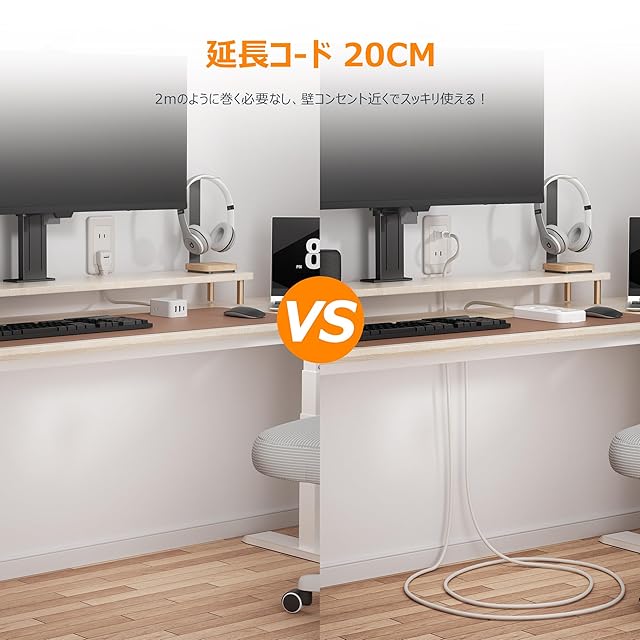 【省スペース設計】サイズはわずか7.8x5.2x3.7cm、重量310gの小型軽量USB付き電源タップ。コンパクトで場所を取らず、持ち運びも簡単。旅行や出張に最適です。さらに、20cmの短いコード設計は、長いコードが不要な環境で大活躍。従来の2m/3m/5mの延長コードのように余計なコードを巻きつける必要がなく、スッキリと美しく整理できます。