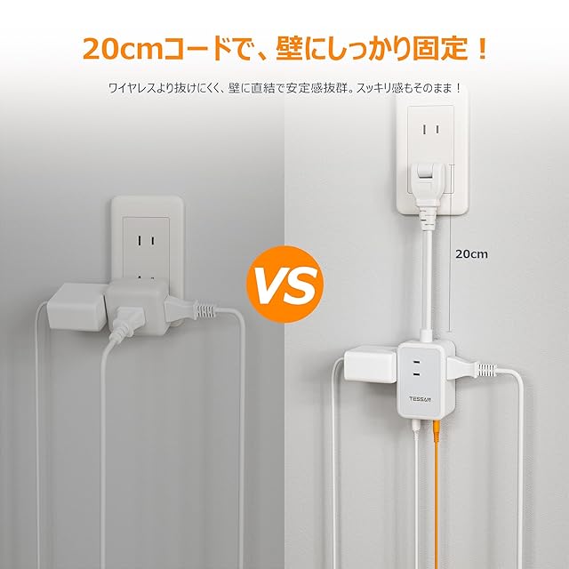 【延長コード 20cmの優勢】こ無線の壁コンセントは、2ピンの差し込み部分だけに頼っているため、複数の機器を接続すると重みで抜けやすくなります。しかし、この20cmの延長コードは、コードの重みが壁側にかかるため、重心が安定。複数の機器を接続しても抜けにくく、安心して使えます!