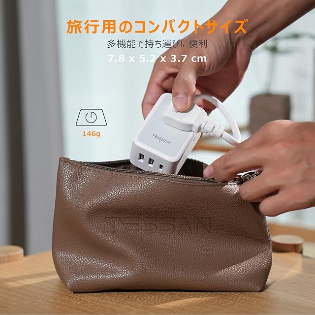 【場所を取らないusb コンセント】5.2x3.7x7.8cmのサイズで、手で握れるぐらい小型で、カバンのスペースを占めません。また、約300gの重量で、軽くて、コンパクトなusb 充電器として自宅だけでなく、旅行や出張などの外出際にもご携帯頂けます。