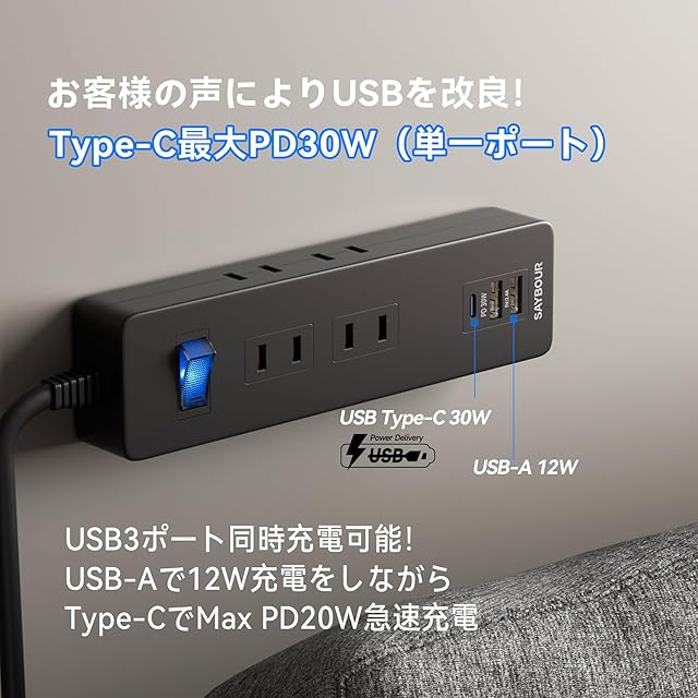 「急速充電できる高出力USB」USB充電機器を使用する方にオススメ!最大出力たっぷり32WのUSBシステム。2種類のUSB Type-C USB-A で、最新機器もアダプタ不要でスッキリ充電。Type-Cは急速充電PD30W対応。接続機器を自動検知し、最適な充電を行う【スマートIC】が充電時間のロスを抑え、過電流や過充電を防止。最新スマホ、タブレット、ワイヤレスイヤホンなど、あらゆるデバイスの充電に。