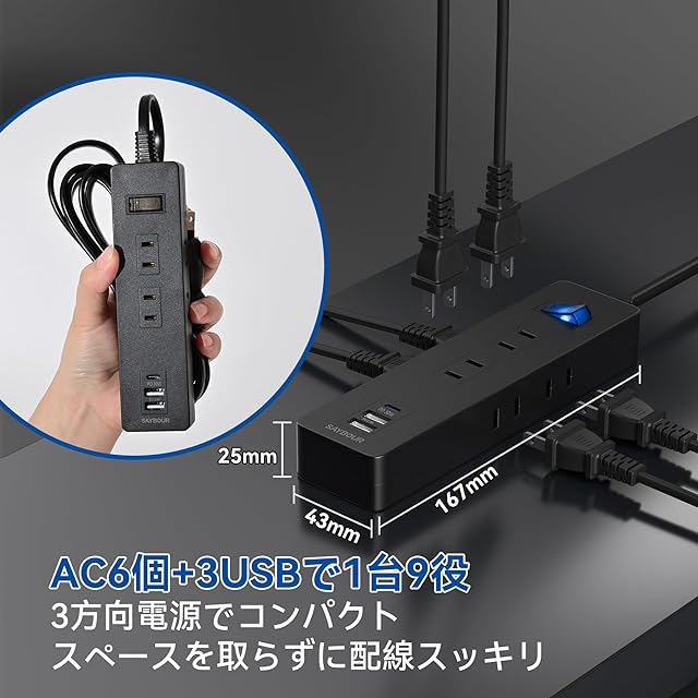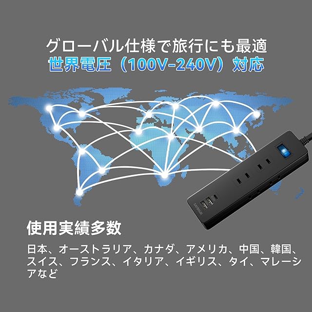 「海外でも使えるコンパクトタップ」100V-240V世界中の電圧に対応し、国内外で使用可能!AC6個+3USBの合計たっぷり9ポート。コンセント穴を3方向に設置したコンパクトな設計で持ち運びにおすすめ。外出先での電源不足をカバーします。※電気安全法に従い製品には国内一般家庭用定格電圧「100V」と記載しています。実際には、100V-240Vの範囲で安全に使用できます。電源タップとしては変圧器不要ですが、変圧機能はございません、必ず接続製品の使用可能電圧をご確認の上ご使用ください。