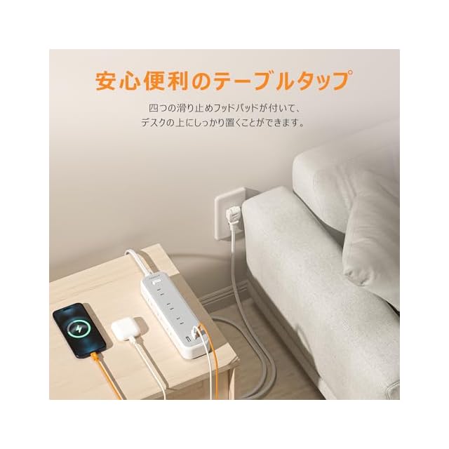 「壁掛け用·卓上に」:コンセントタップは壁等に仮固定できるフック穴付き、壁にかけてご利用できます。省スペースで、配線もスッキリになります。電源タップの底の四角にゴム製の滑り止めマットがついており、卓上で安定感があります。