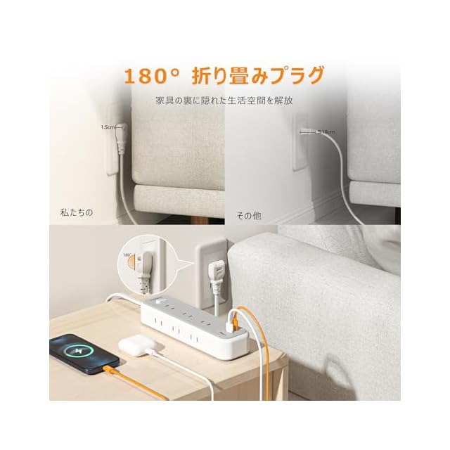 【180°回転プラグ付きのusb コンセント】このたこあしコンセントは、180°回転プラグを採用しているため、狭いスペースでも配線がしやすくなっています。プラグの根本には絶縁キャップを装備し、万一の発熱時にも安心です。コンパクトで使いやすい設計で、家庭やオフィスでの日常使いに最適です。
