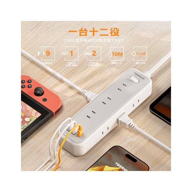 「一台12役·電源タップ」コンセント差込口9口に加えUSB-Cポート1つとUSB-Aポート2つを搭載します。ACコンセントで複数の家電を接続しながら、USBポートでお使いのUSB機器を充電できます。家やオフィスに複数の電子機器に充電したい場合、これ一つのusb電源タップがあれば、十分です。