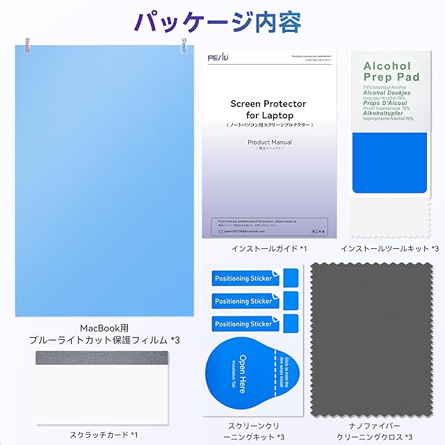 【お得なパッケージ】MacBook 13.6インチ用ブルーライトカットスクリーンプロテクター *3、取り付けツールキット *3、スクリーンクリーニングキット *3、スクラッチカード *1、製品ガイド *1。 Peslvは生産、加工、販売を統合した工場です。 お客様にもっとご満足いただけるよう努めています。 安心してお買い求めください。