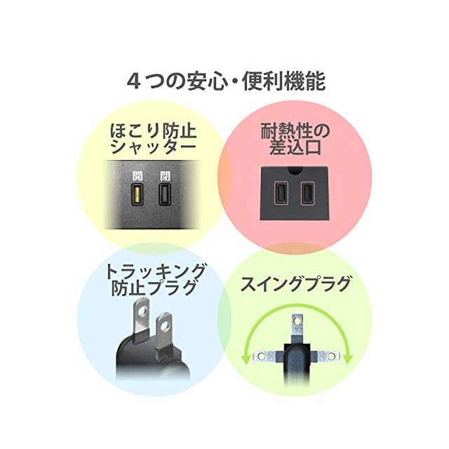 未使用時にほこりの侵入を防止する「ほこり防止シャッター」を装備した電源タップです。