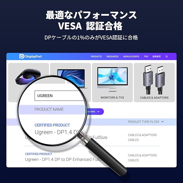 UGREEN 8K Displayport ケーブル 1M DP1.4 ケーブル VESA認証 8K 60Hz 4K 240Hz HDR GSync対応 32.4Gbps高速 ゲーミング ディスプレイポートケーブル | つむぎ屋