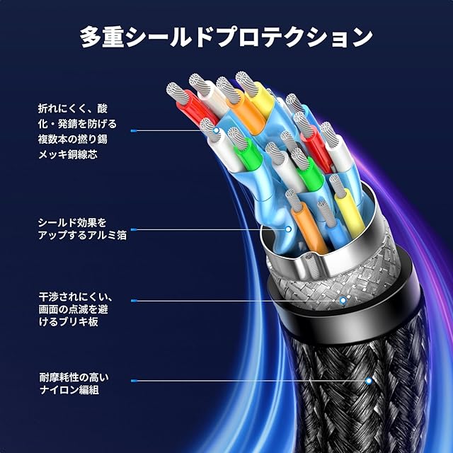 【干渉防止機能】このアルミdpケーブルは内部にブリキが付いており、EMI/EMCテストに合格しています。 マルチストランド錫メッキ銅コア、アルミ箔、アース線、金属準備メッシュなどの複数のシールドにより、このラインが安定したビデオ信号とオーディオ信号を伝送し、画面の輝きを効果的に防ぎます。
