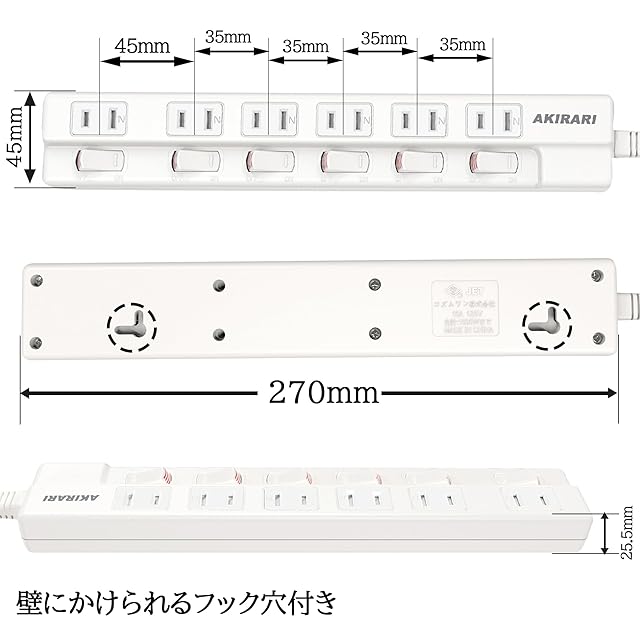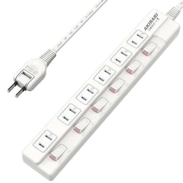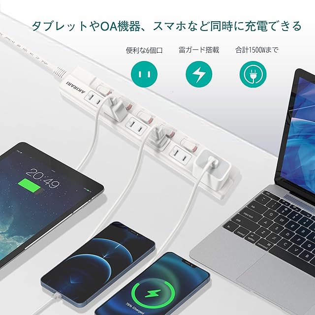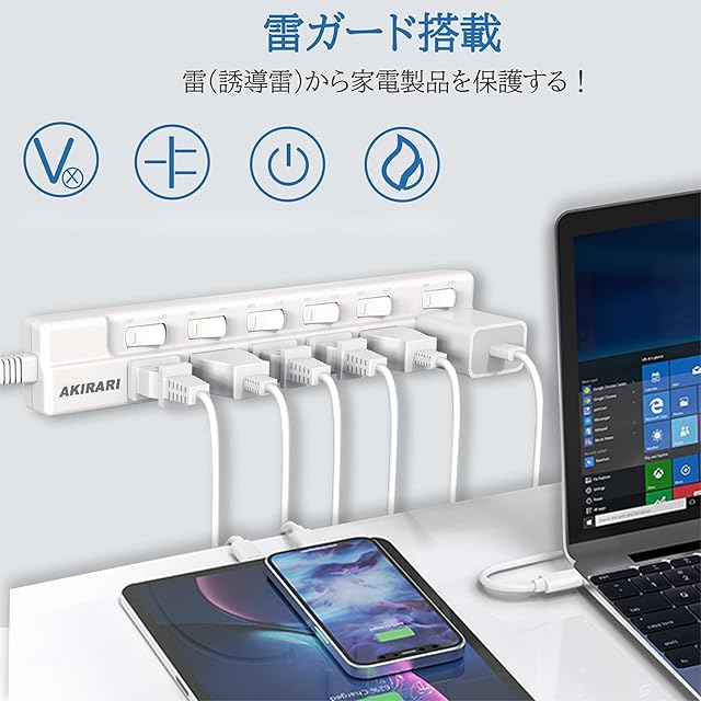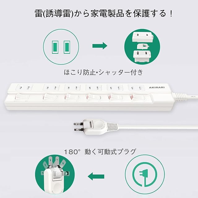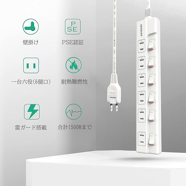 【防塵防雷 個別スイッチ】 電源タップ 6口 AKIRARI コンセントタップ ホワイト 雷ガード スイッチ電源タップ テーブルタップ 延長ケーブル 1m 家庭用 6個口 ほこりシャッター付 過電流 過熱保護 すき間 180度スイングプラグ トラッキング防止 節電 省エネ 延長コード おしゃれ 電源 壁 卓上 薄型 コンパクト (1M) | つむぎ屋