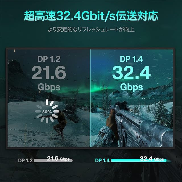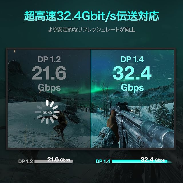 【80Gbpsの高速伝送】DPケーブル 2.1は80Gbs 超高速帯域幅にサポートし、伝送速度はHDMI 2.1ケーブルの約2 倍です。最大4K@240Hz高リフレッシュレートと16k高解像度の両方をサポートし、遅延率を低減、グラフィックカードのパフォーマンスを最大化します。ゲームやオフィスや映画など、さまざまな場面に対応しています。