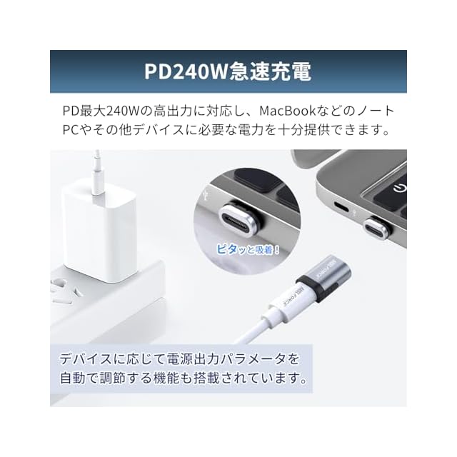 【USB4.0 マグネット式USB-Cアダプタ】磁石の力で簡単に接続でき、繰り返しの抜き差しによる機器の損傷を防ぎます。24ピン設計により、PD最大240Wの急速充電と最大40Gbpsの高速データ転送が可能なUSB-C対応の変換アダプタです。
