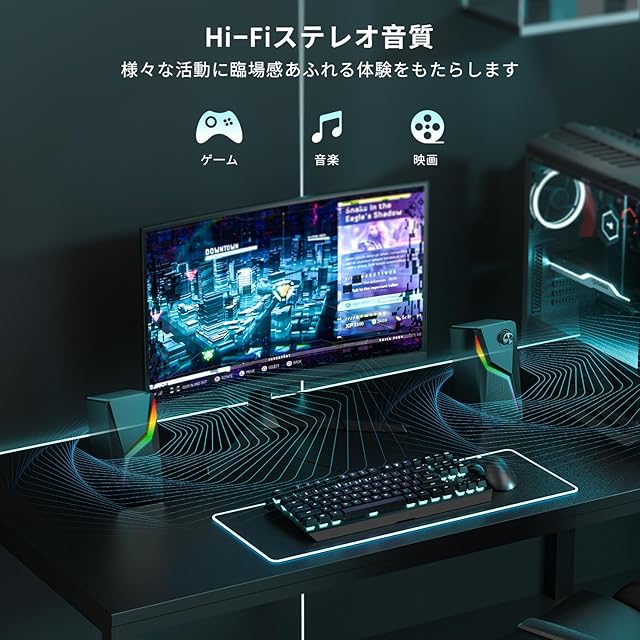 【フルレンジステレオ音質】このPCスピーカーには高度なサウンドドライバーとフルレンジ2.0ch強化ステレオコアが搭載されており、映画鑑賞、ゲームプレイ、音楽鑑賞などのエンターテイメント活動に完璧な雰囲気を提供しています。このゲーミングスピーカーは、卓越した高音と強力な低音を実現し、臨場感あふれるオーディオ体験を実現します。