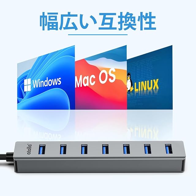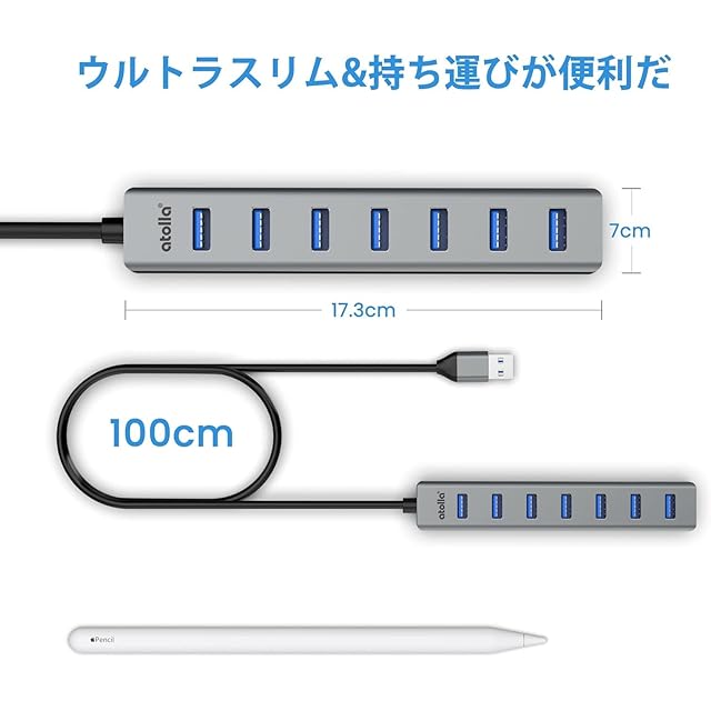 atolla USBハブ USB3.0 HUB 7ポート 100cmケーブル USB3.0ハブ USB 拡張 ウルトラスリム 5Gbps超高速転送 アルミニウム合金 軽量 追加5V/3A電力供給ポートWindows/Linux/Mac OS/Android/Chrome OS/PS4/MacBook等OSとPC対応 在宅勤務 | つむぎ屋